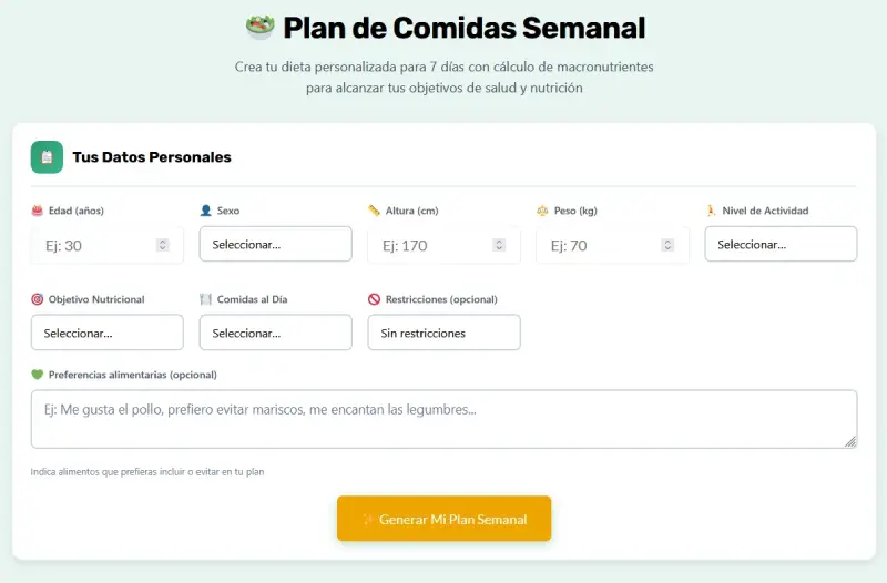 Precisamente para evitar planes genéricos y complicados, hemos desarrollado una app pensada para crear un plan de comidas personalizado, claro y fácil de usar, incluso si no tienes conocimientos de nutrición.
