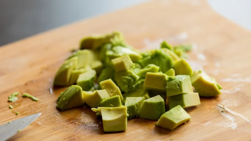 Pica 2 aguacates maduros pero firmes en dados del mismo tamaño que el salmón y colócalos en otro bol.