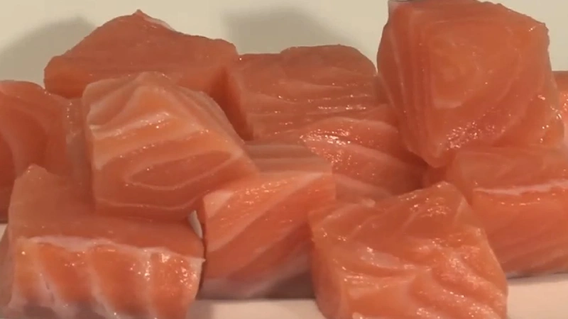 Corta 400 g de salmón fresco en dados uniformes de aproximadamente medio centímetro.